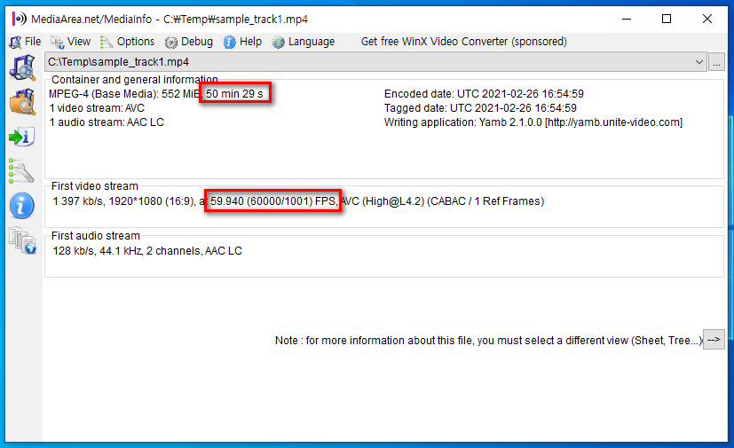 이렇게 합쳐진 새로운 파일은 정상적으로 재생되었고, MediaInfo로 보면 원래 정상적인 러닝타임인 50분대와 59.94 FPS로 잘 표시됨을 확인할 수 있었다.