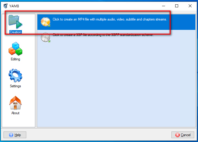 Yamb를 실행하고 첫 메뉴인 Creation에 Click to create an MP4 file with multiple audio, video, subtitle and chapters streams를 선택한다.