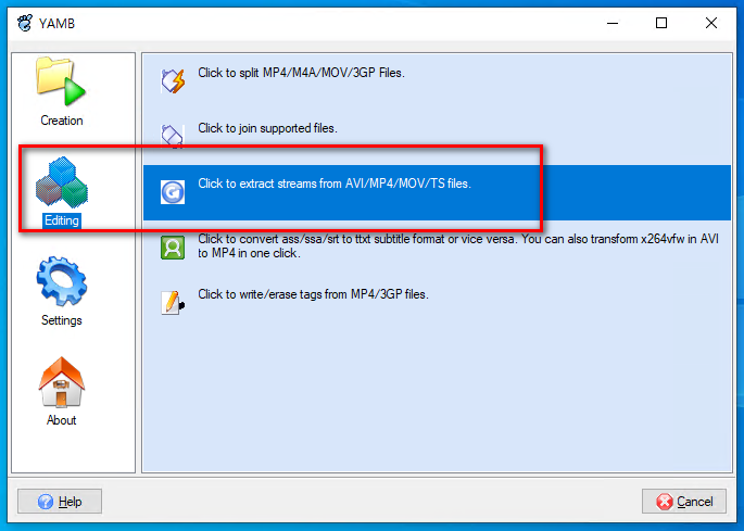Yamb를 실행하고 Editing 들어가서 Click to extract streams from AVI/MP4/MOV/TS files를 누르면 Video와 Audio를 분리할 수 있다.
