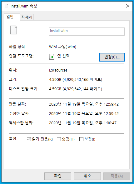 그런데 FAT32는 단일 파일 사이즈 4GB라는 제한이 있다. 현재 윈도우 10 20H2 ISO 파일에 들어있는 Install.wim 파일의 크기는 4GB를 넘기 때문에 FAT32에 담을 수 없다.