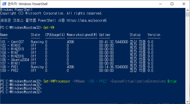 집 PC에서 Proxmox VE 설치해서 테스트 해보려고 Hyper-V로 VM 생성해서 설치를 시도했는데, KVM 가상화 지원하지 않는다는 문구가 떴다. 그래서 해당 VM에 Hyper-V 설정으로 Nested Virtualization을 활성화 해서 해결하였다.