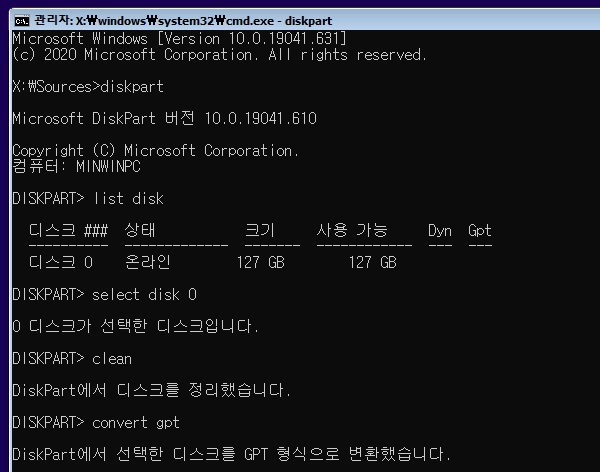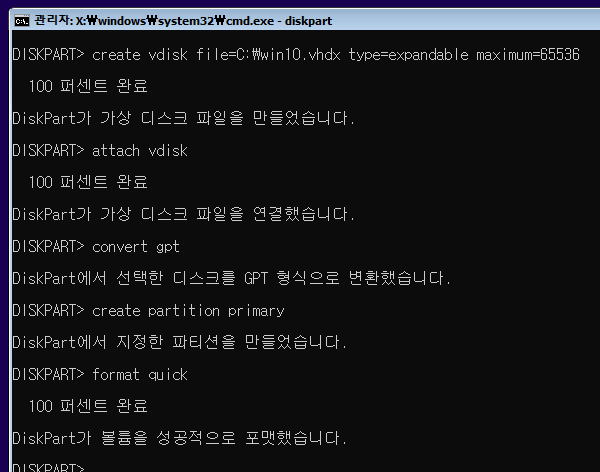 여기서부터 diskpart로 disk 초기화, GPT 변환, EFI 파티션 생성, VHDX 생성 등의 작업을 진행할 것이다.