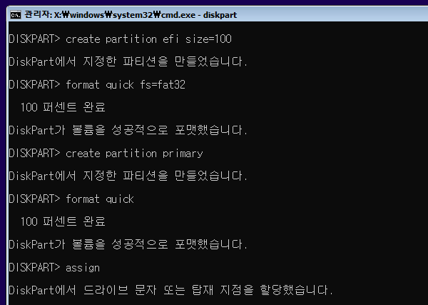 ## EFI 부팅용 System 파티션 100MB 생성, FAT32로 포맷 create partition efi size=100 format quick fs=fat32