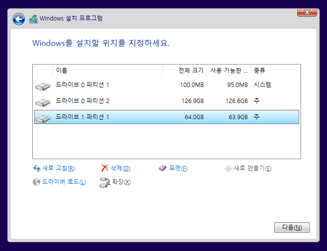 여기까지 진행해놓고 설치 화면에서 다음, 다음 넘어가다 보면 방금 붙인 VHDX Disk 64GB가 보인다. 여기에 윈도우 10을 설치하면 된다.