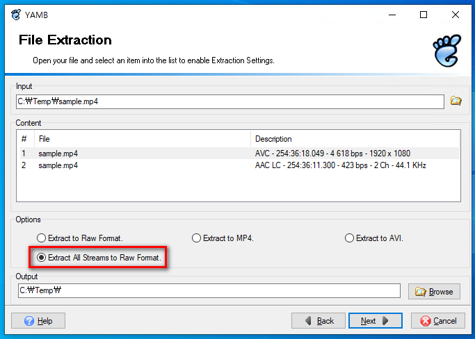 문제의 파일을 선택하고 Extract All Streams to Raw Format 선택하면 포함된 Video와 Audio를 추출해준다.
