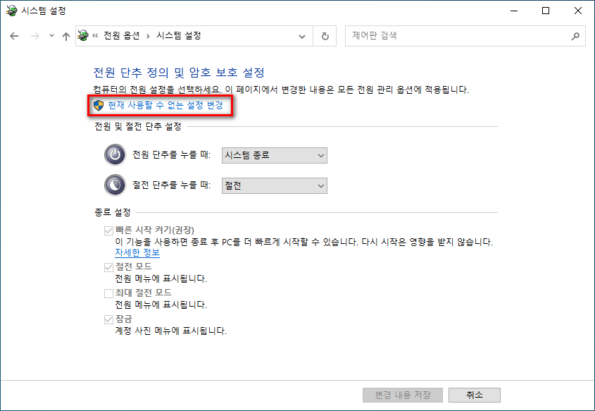 하단 종료 설정 부분에 빠른 시작 켜기 부분이 체크되어 있는데, 잠겨있어서 수정할 수 없다.